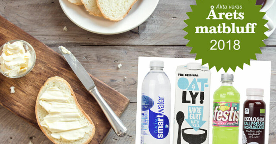 120 nomineringar har blivit fem finalister: Syftet är att uppmärksamma och sätta press på livsmedelsproducenter som säljer produkter som marknadsförs på ett sådant sätt att konsumenter känner sig lurade. Här är matprodukterna som kan vara årets matbluffar. Finalisterna till årets matbluff 2018. Årets matbluff är konsumenternas pris och därför vill äkta vara att så många som möjligt ska vara med och rösta.